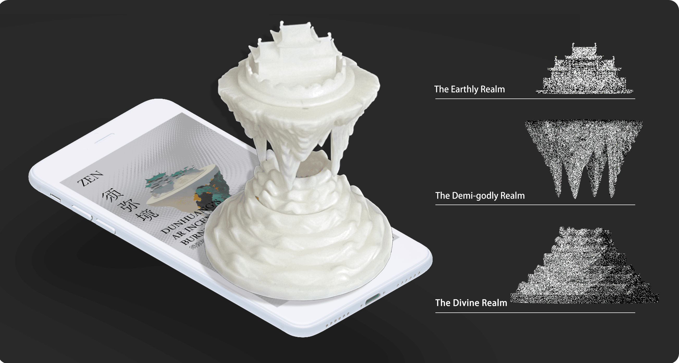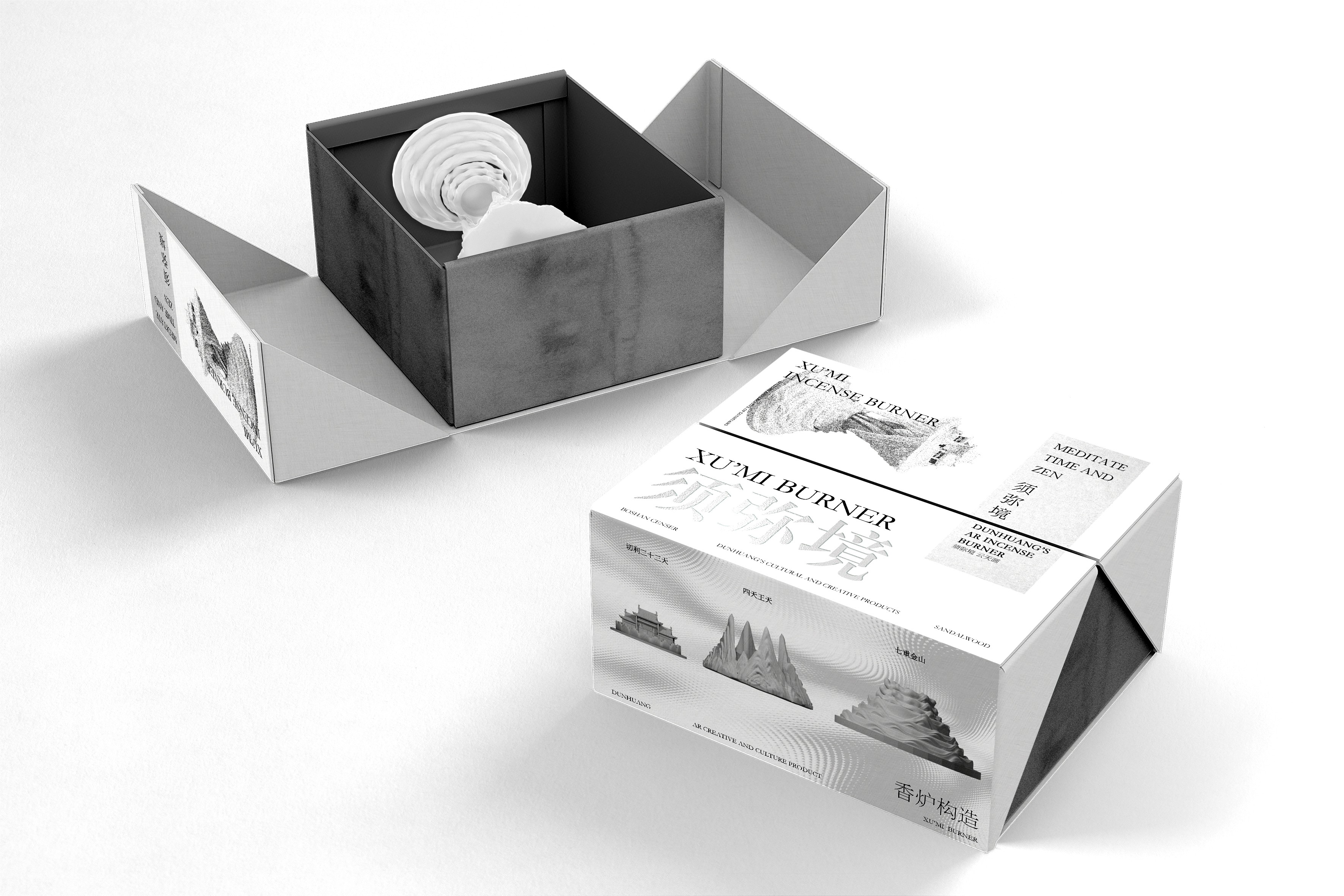 "SUMU Sight" is a segmented incense burner resembling a Boshan Lu, created through 3D printing. The structure comprises three parts: the Seven Treasure Mountains, the Four Heavenly Kings, and the Trāyastriṃśa Heaven, each built from 3D printed components that can be assembled by stacking. Incense can be placed at the central part, "The Seven Mountains," with the "Four Heavenly Kings" peaks interspersed above, allowing for the natural flow of smoke. In terms of AR narrative content, based on the basic narratives of Asuras and deities in the murals, we extracted three significant elements from Mount Meru to form the three components of the incense burner, realizing a presentation of tangible narrative content. Additionally, utilizing AR technology, "SUMU Sight" enhances the narrative beyond the physical incense burner, with virtual images surrounding the burner.